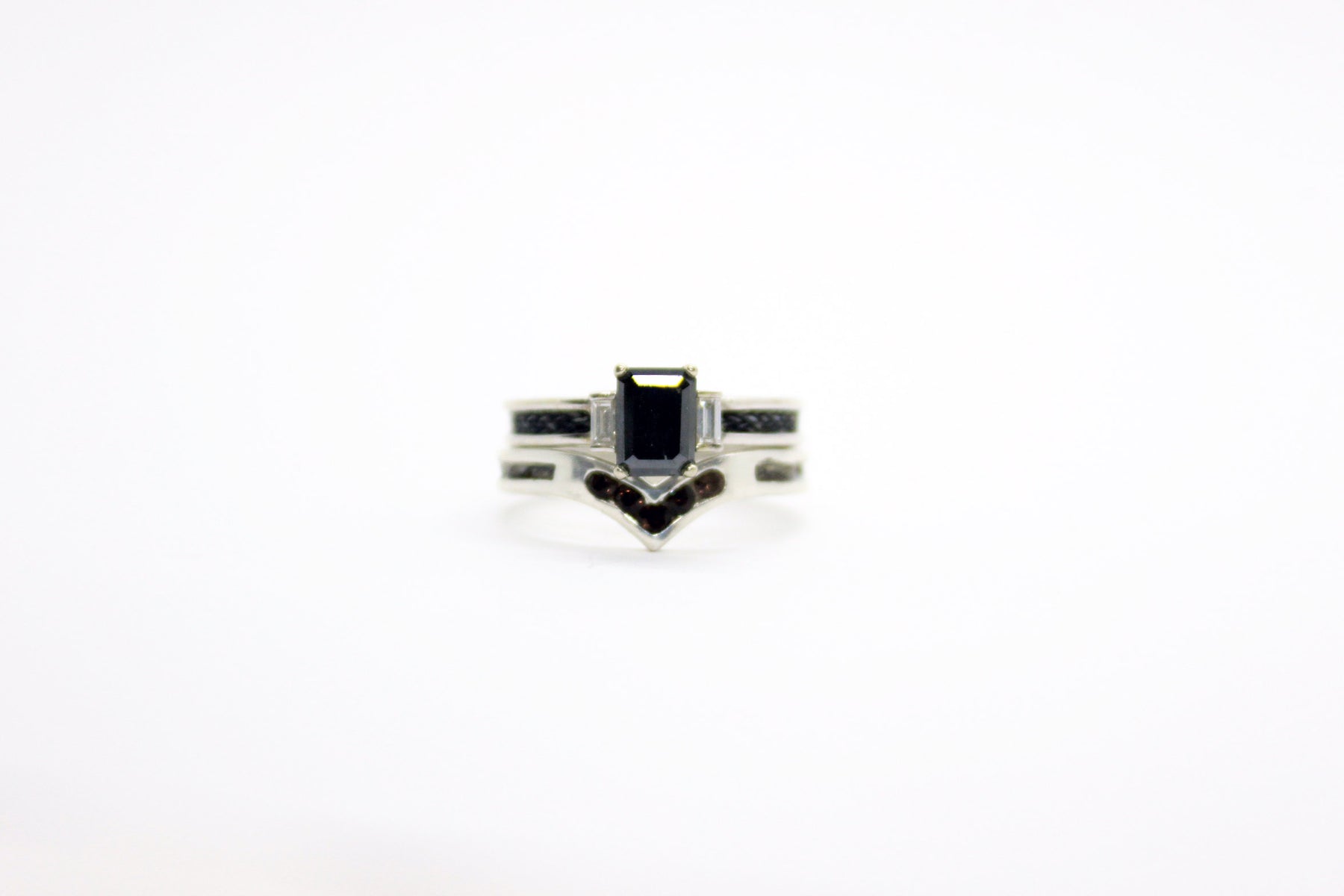 White gold, diamond and black diamond horsehair ring sitting on top of a white gold horsehair ring with smokey quartz stones, on a white background